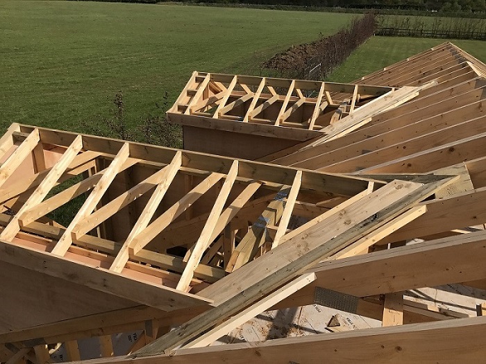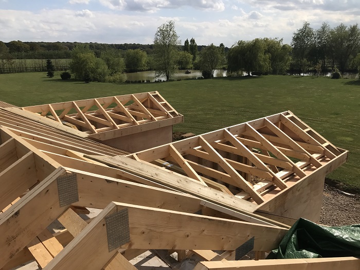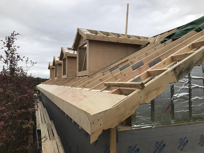 We have recently completed a large trussed roof, with 8 large gable ended dormers. This was over a 5 bay car garage with morticed and tenoned solid oak framework to the front elevation. Finished with Cedar feather edge cladding and oak fascias.
