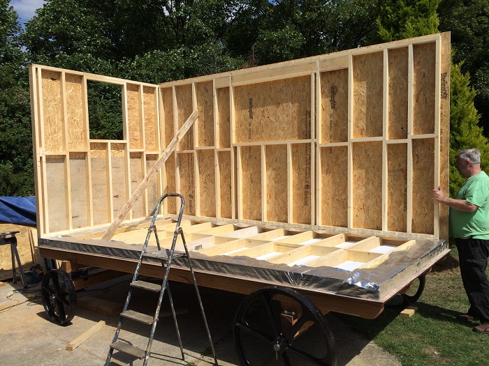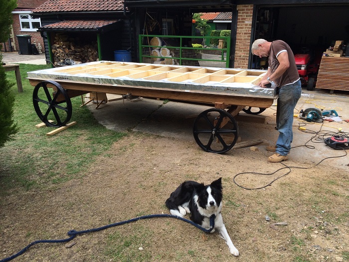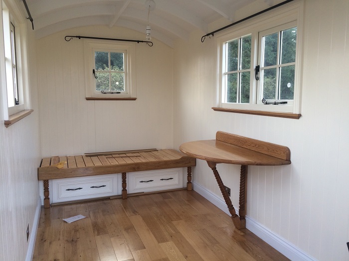 This was a unusual project, but one we loved doing. A vintage style Shepard’s Hut. It has a solid oak chassis, stud work was clad in traditional corrugated Tin. The interior has a functioning log burner, a Bench seat that slides into a bed area with a folding oak side table. And solid oak floor to finish it all off.
